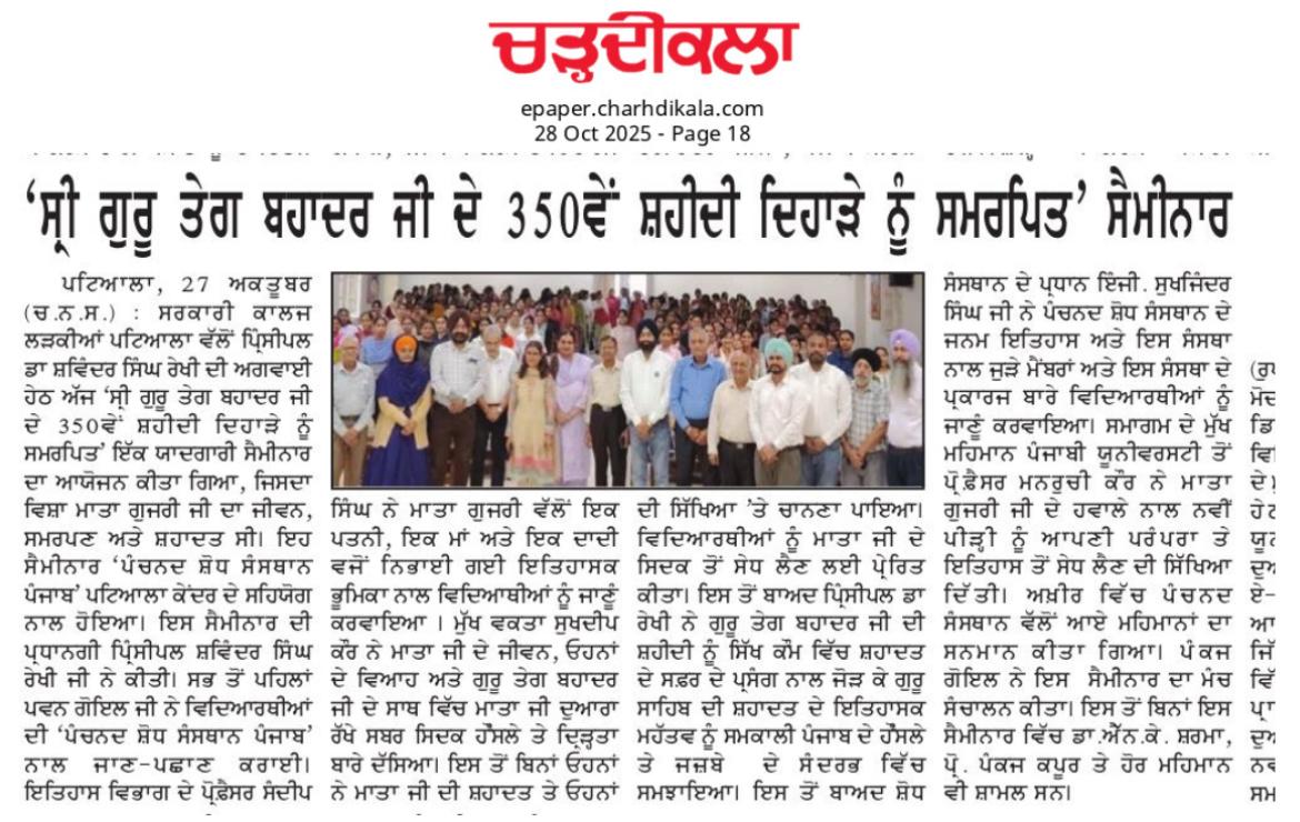 Seminar on Martyr Day of Shri Guru Teg Bhadur ji